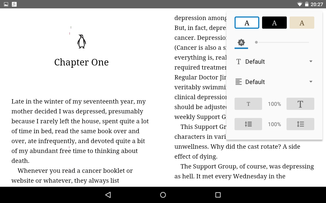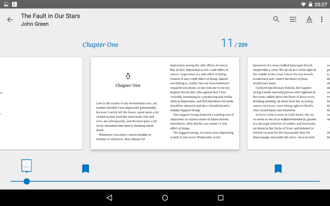 One annoyance I always had with Play Books on Android was underlining text. If you highlighted text near the top of the page on the old app, the action bar would cover the text and you couldn’t see what you were doing. Now the action bar is done away with in this view in favour of a floating text option bubble. Much better.