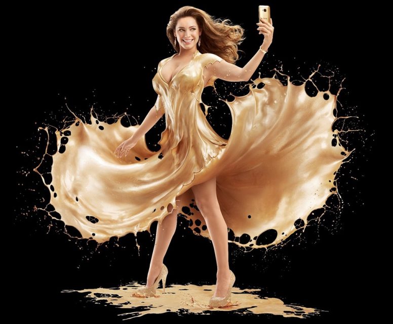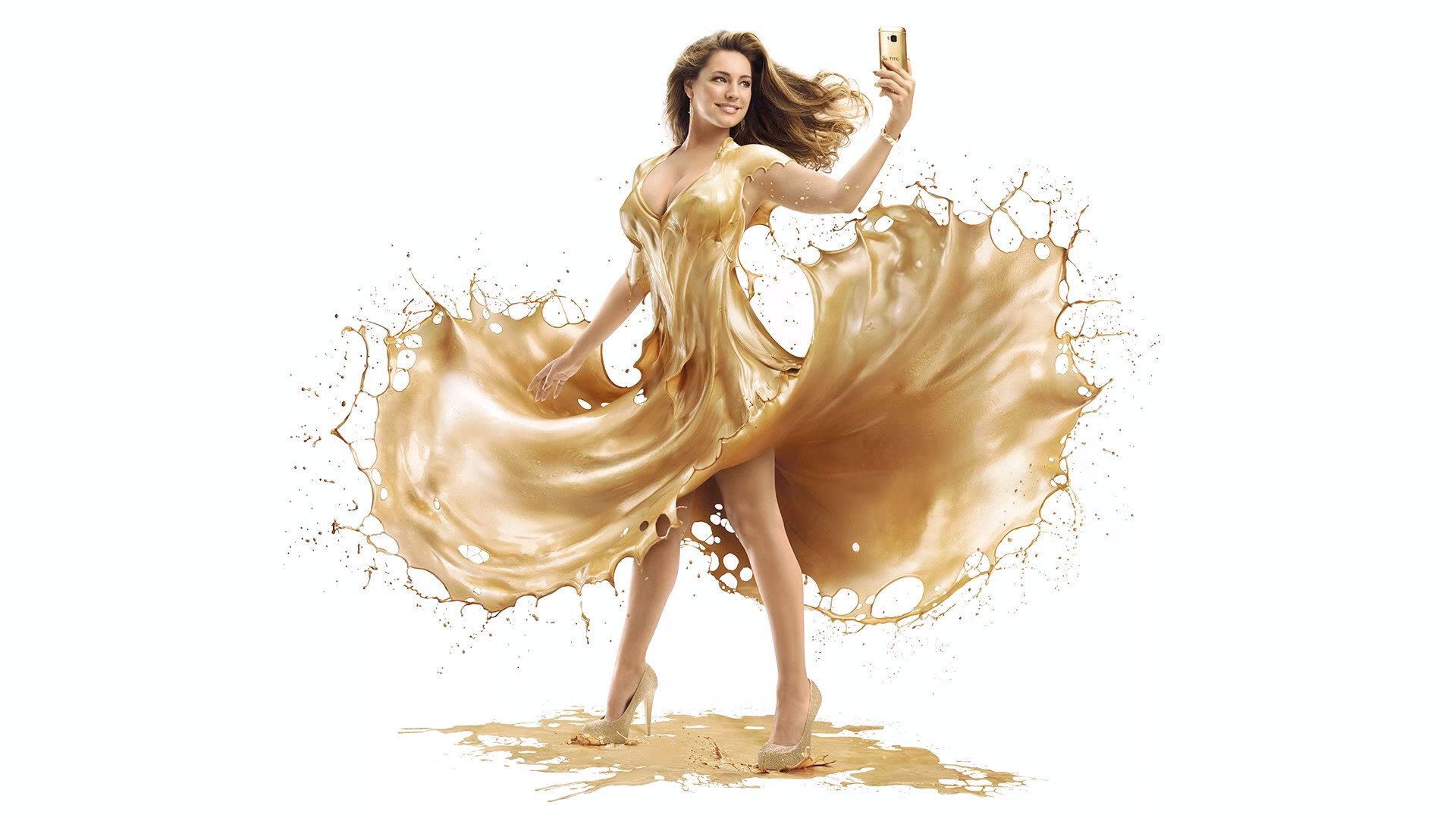 To celebrate the launch of the new One M9 Gold Edition on EE, HTC has employed popular English model Kelly Brook for a new advert in which they’ve showered her in paint to create stunning images that look like she is wearing a dress made of liquid gold.